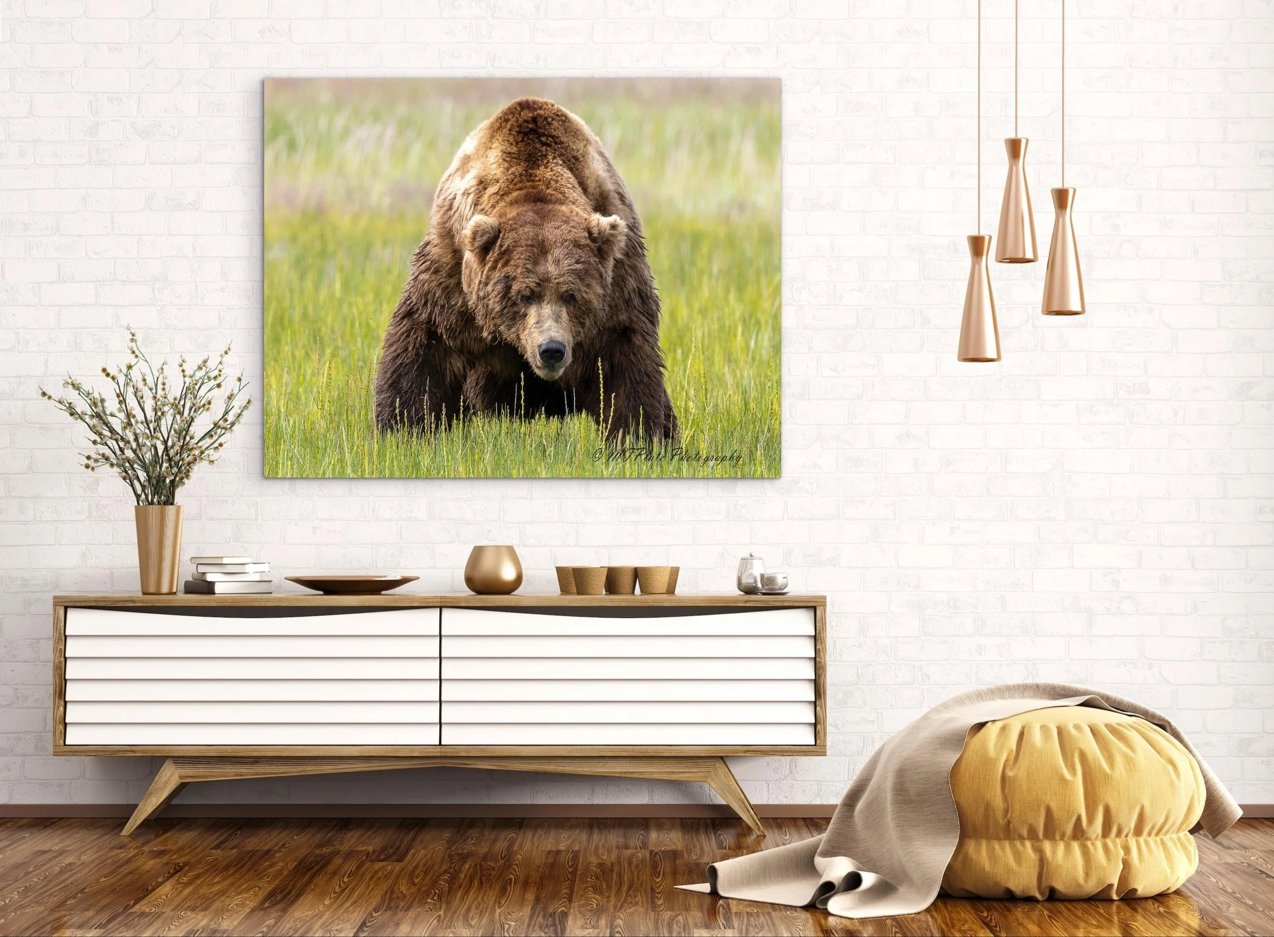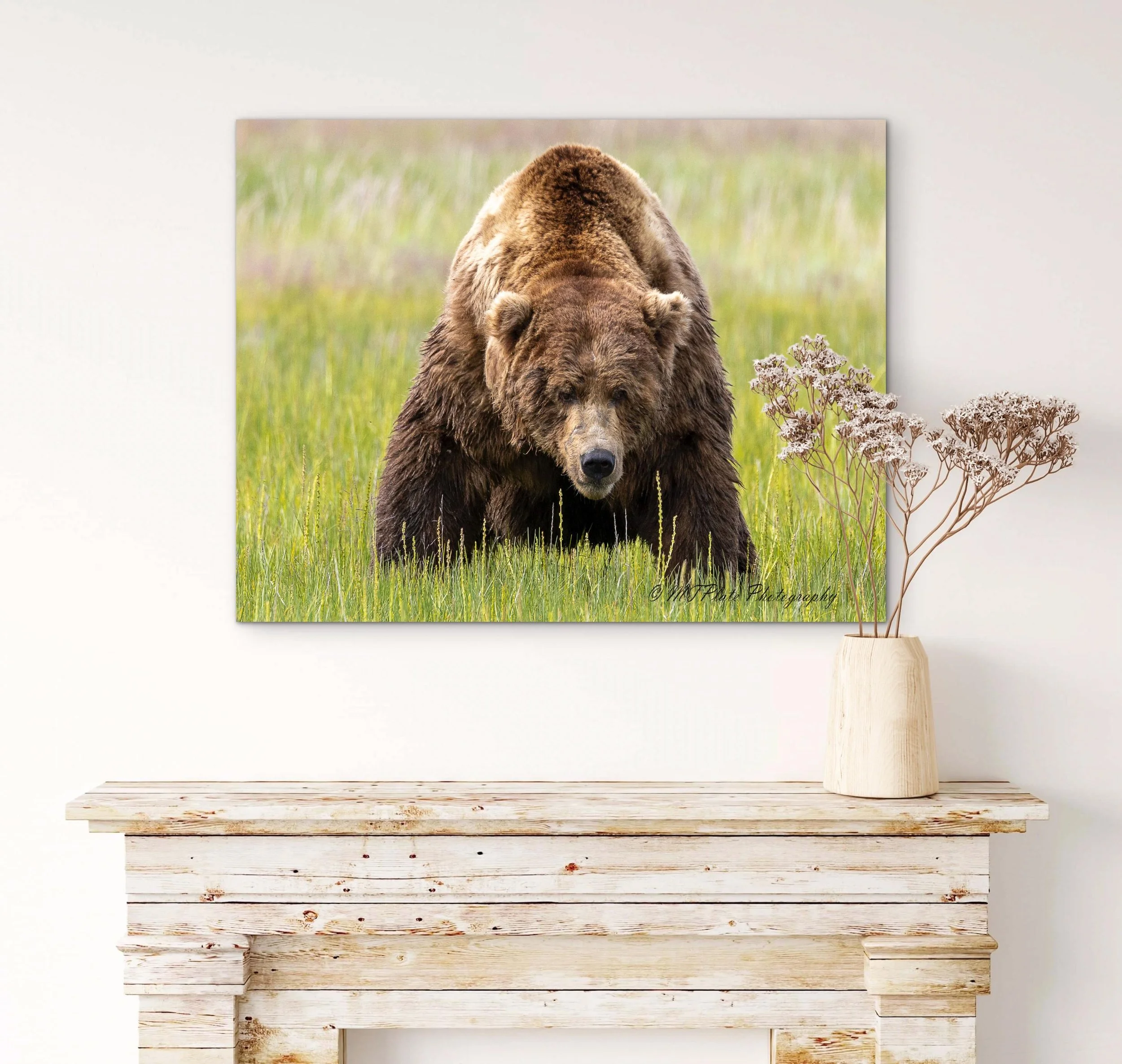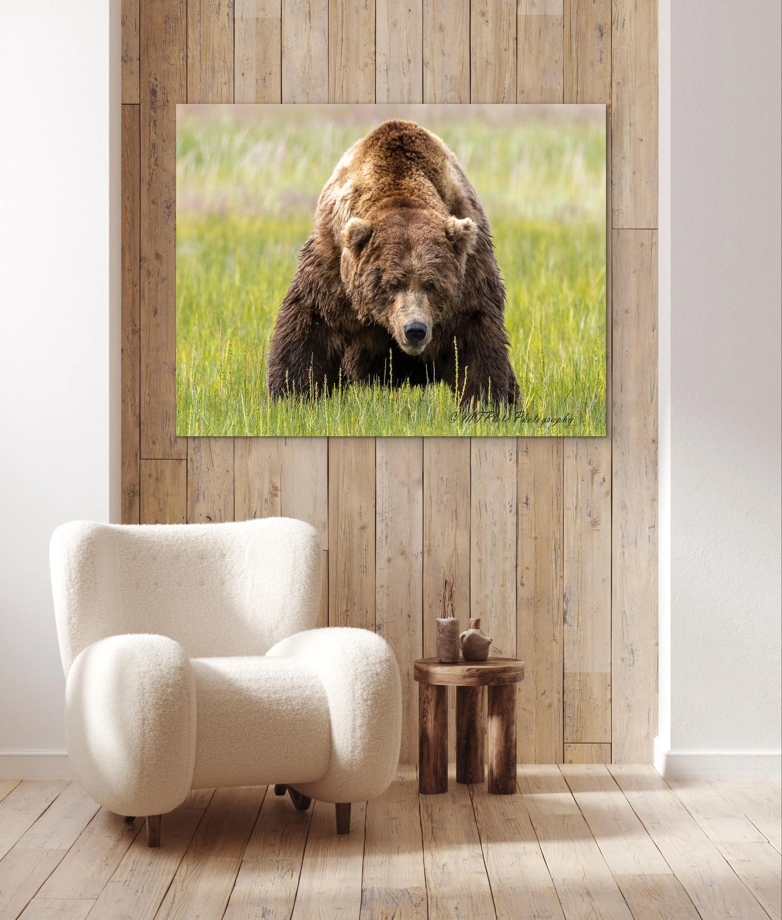 This premium aluminum surface option—favored by galleries and collectors—elevates the power and presence of the photograph. Featuring a smooth, high-gloss finish on a pure white base, the image takes on a luminous depth that mimics the elegance of glass without the distracting glare of acrylic. Every tonal detail in the bear’s form—from the glint of light on its fur to the inky shadows of the water droplets—is rendered with crisp precision and gallery-grade clarity. Ideal for contemporary spaces and fine art collections, this surface brings a bold, refined edge to wildlife photography.**