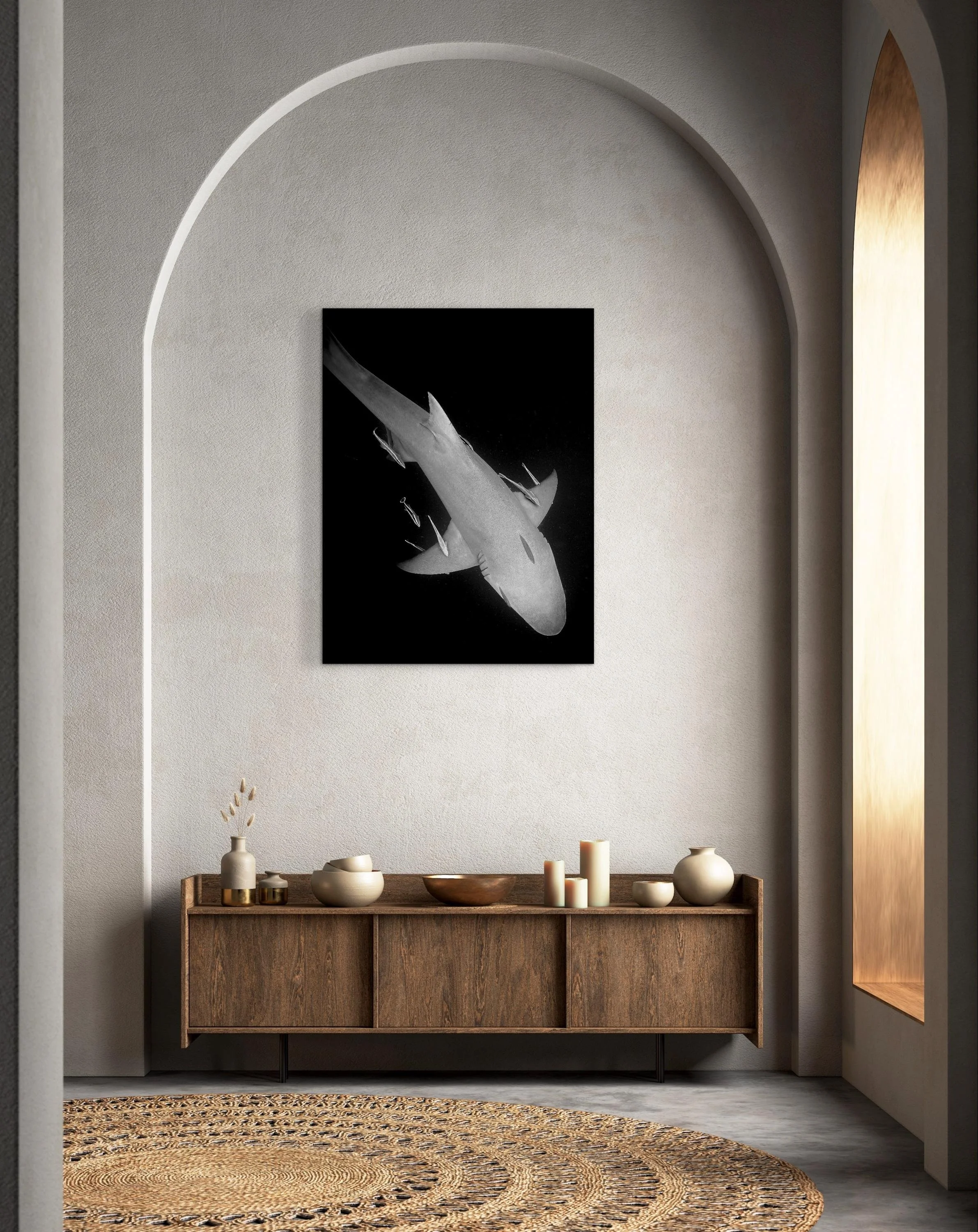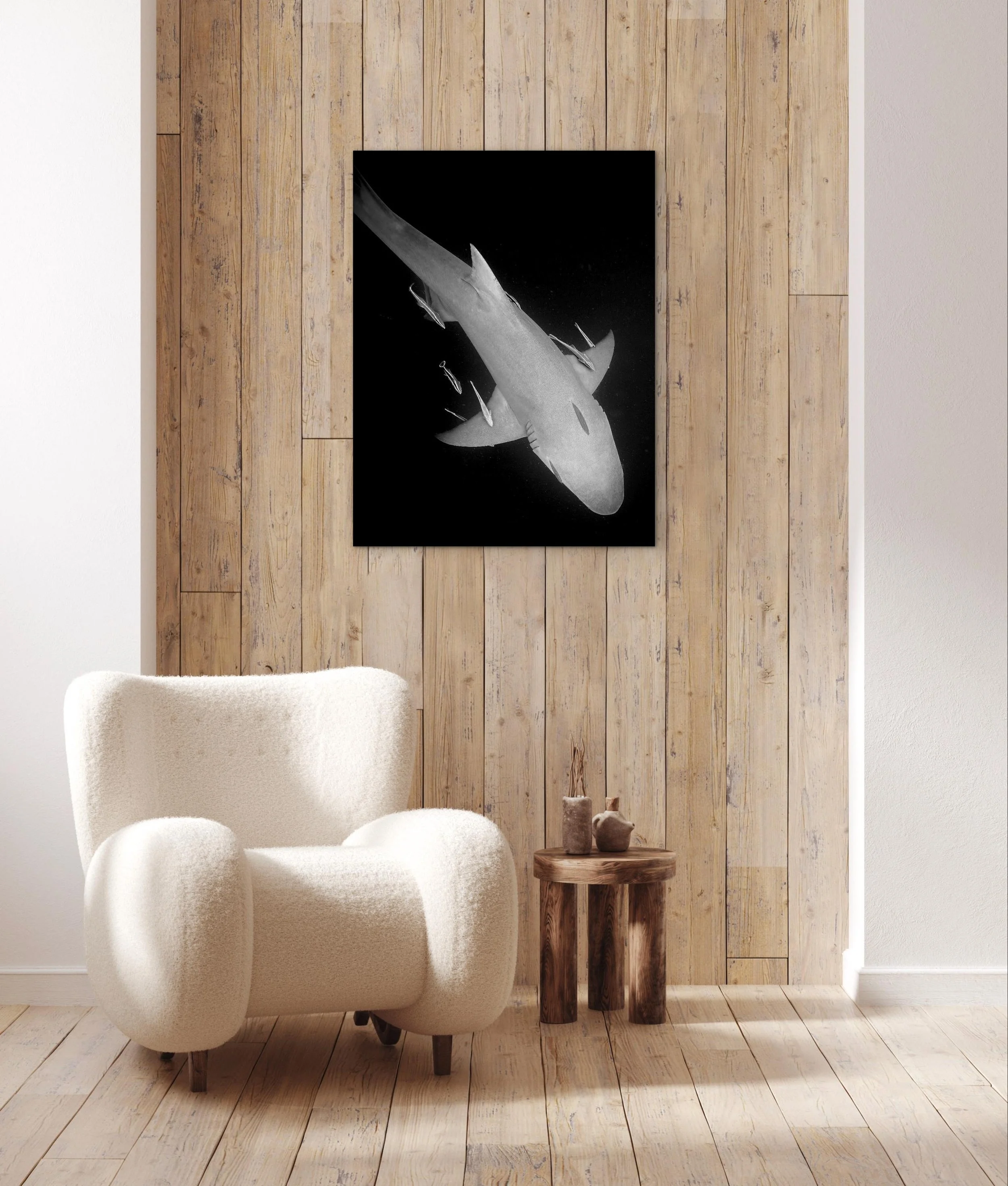 This premium aluminum surface option—favored by galleries and collectors—elevates the power and presence of black & white photography. Featuring a smooth, high-gloss finish on a pure white base, the image takes on a luminous depth that mimics the elegance of glass without the distracting glare of acrylic. Every tonal detail in the shark’s form—from the glint of light on its skin to the inky shadows of the deep—is rendered with crisp precision and gallery-grade clarity. Ideal for contemporary spaces and fine art collections, this surface brings a bold, refined edge to marine photography.**