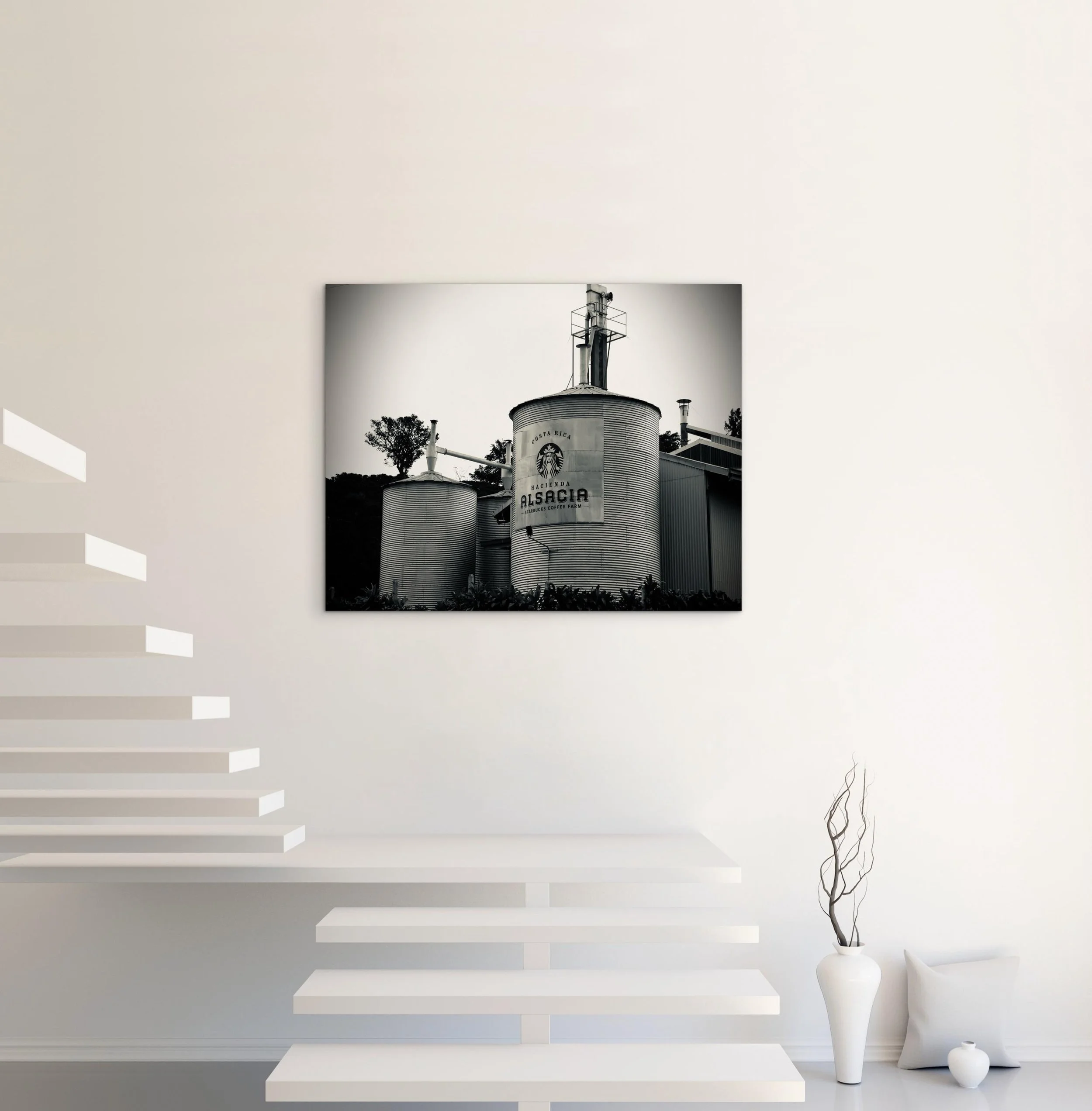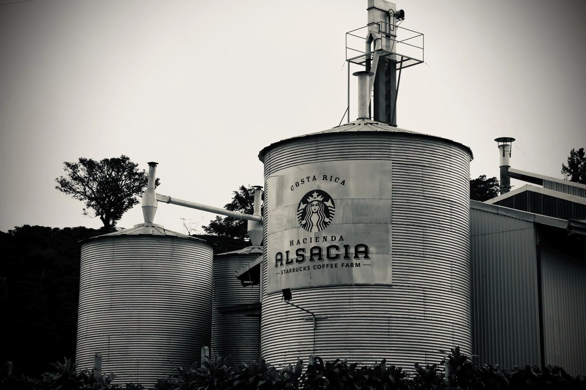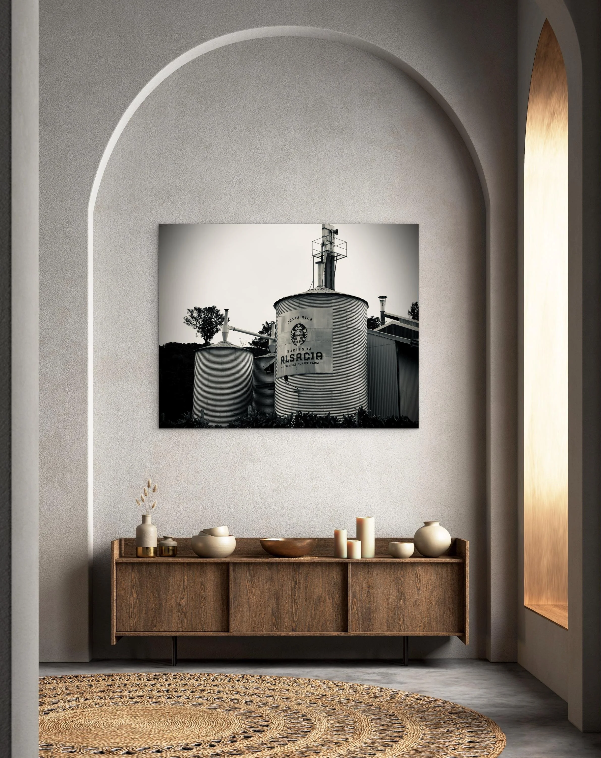 Nestled in the lush highlands of Costa Rica, “Hacienda Alsacia” captures the serene beauty and quiet strength of Starbucks’ first and only coffee farm. This striking black-and-white photograph highlights the architectural form and industrial elegance of the plantation’s silos against the backdrop of rich, tropical terrain—an homage to both craftsmanship and nature’s rhythm.